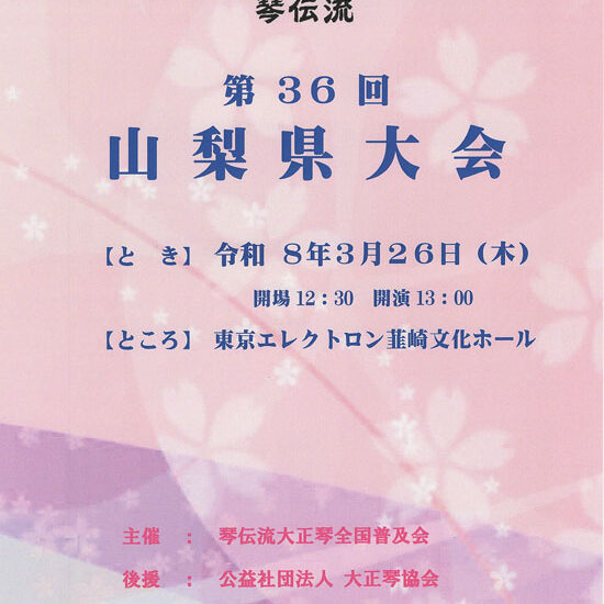 3月26日(木)に、韮崎市の東京エレクトロン韮崎文化ホールで「第36回山梨県大会」が開催されます。 春は新しいことを始めるのに最も適した季節。 お気軽にご来場いただき、大正琴の和やかな世界をご鑑賞ください。 「琴伝流大正…