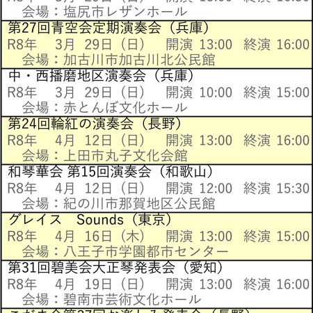 向こう3ヶ月分の全国各地で活動している琴伝流のグループの演奏会をご案内します。 お近くの方はお気軽にお越しいただき、大正琴を楽しむ会員の生き生きとした姿を是非一度ご覧ください。 ※開演・終演時間は都合により変更する場合が…