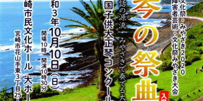 10月10日(日)に、「第35回国民文化祭・みやざき2020」「第20回全国障害者芸術・文化祭みやざき大会」の「大正琴の祭典」が宮崎市の宮崎市民文化ホールで開催されます。