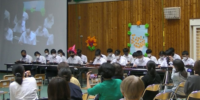 長野県伊那市の西箕輪中学校の文化祭「第54回紅葉祭」で、10月2日(土)に総合学習の発表があり、3年生の約20名が大正琴で「剣の舞」と「千本桜」の演奏を披露しました。