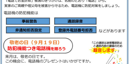 今月の長野県からの啓蒙チラシでも防犯機能付きの電話機を使うことを勧めています。