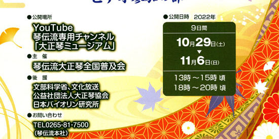 公開はYouTube琴伝流専用チャンネル「大正琴ミュージアム」で行い、昨年同様に大会らしさを演出するため各グループの放映時間を決めて1日2回期間限定で公開します。