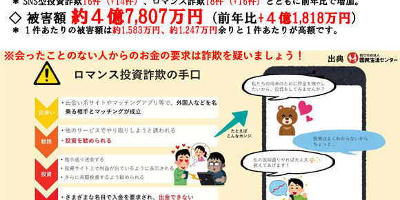 特に最近は投資詐欺やロマンス詐欺が急増しています。