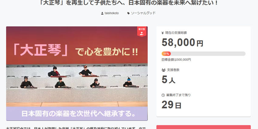 公益社団法人大正琴協会では、大正琴音楽文化の次世代継承事業支援のためのクラウドファンディングを募集中です。