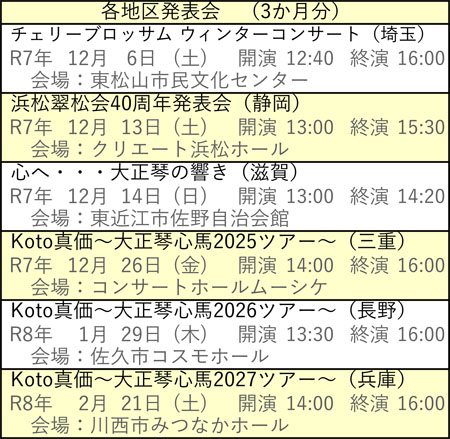 向こう3ヶ月分の全国各地で活動している琴伝流のグループの演奏会をご案内します。