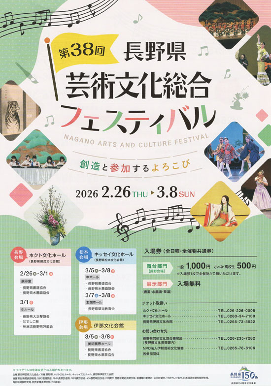 2月26日(木)から3月8日(日)まで、長野県芸術文化協会主催の「第38回長野県芸術文化総合フェスティバル」が開催されます。