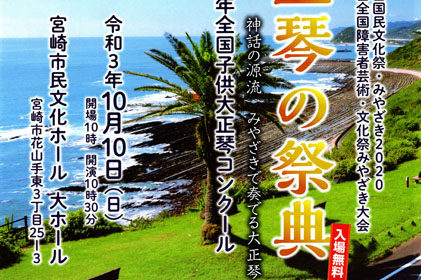 10月10日(日)に、「第35回国民文化祭・みやざき2020」「第20回全国障害者芸術・文化祭みやざき大会」の「大正琴の祭典」が宮崎市の宮崎市民文化ホールで開催されます。 一般の部の大人のグループによる演奏のほか、子供の…