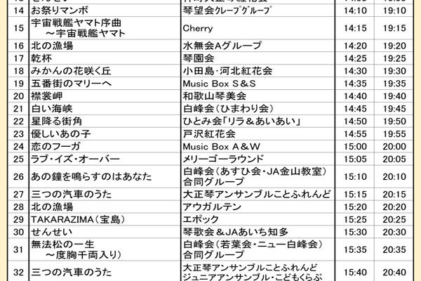 「琴伝流大正琴第40回記念全国大会・秋」のプログラムをご紹介します。 西日本を中心に31グループが出演し、アニメソングから演歌まで様々な曲を演奏します。 当日券もありますので、琴伝流以外の方もお気軽にご来場ください。 「…