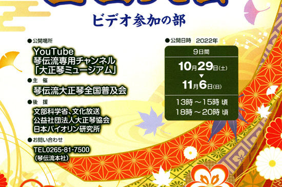 新型コロナの影響で公開が遅れていた「琴伝流大正琴第36回全国大会・ビデオ参加の部」を、10月30日(土)から11月7日(日)までYouTube琴伝流専用チャンネル「大正琴ミュージアム」で期間を限定して公開します。 期間中…