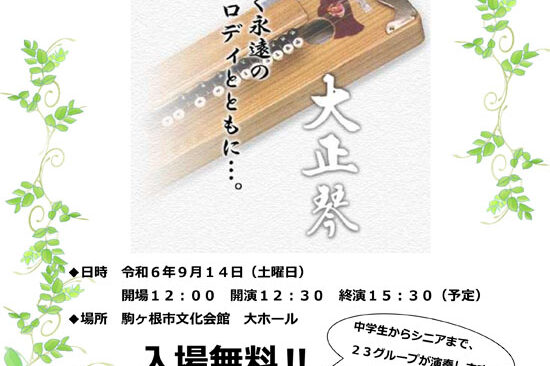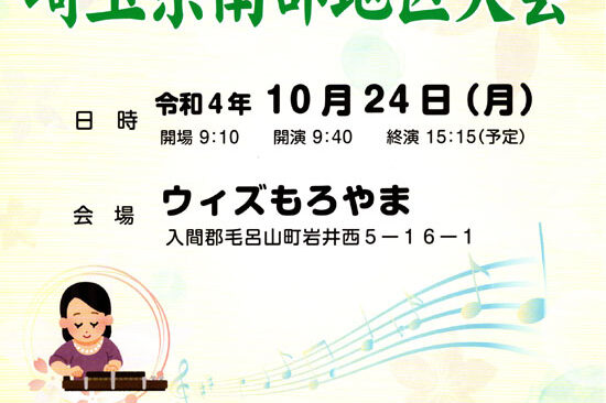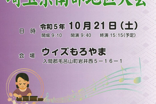 11月30日(火)に毛呂山町のウィズもろやまで、琴伝流大正琴埼玉南支部主催の「第37回埼玉県南部地区大会」が開催されます。 「琴伝流大正琴第37回埼玉県南部地区大会」 日時:令和3年11月30日(火)開演10:00、…