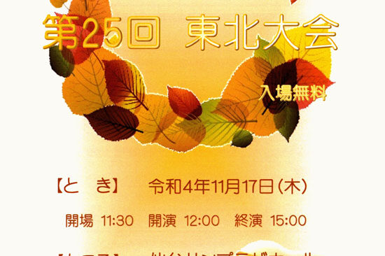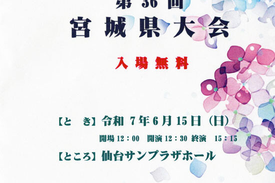 11月14日(日)に仙台市の仙台サンプラザホールで、「第24回東北大会」が開催されます。 新型コロナ感染予防策を施しての大会のため、客席数に制限がありますがお近くの方はお気軽にお越しください。 なお、熱のある方や体調の悪…