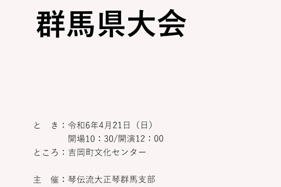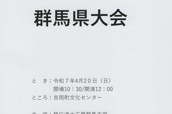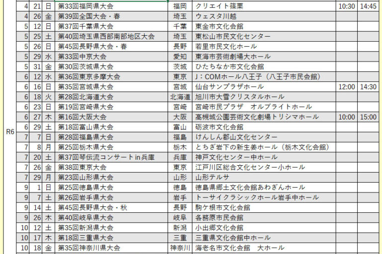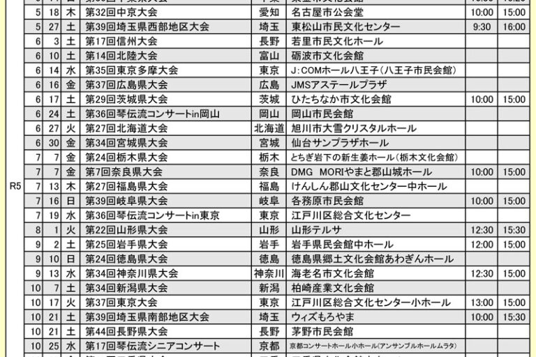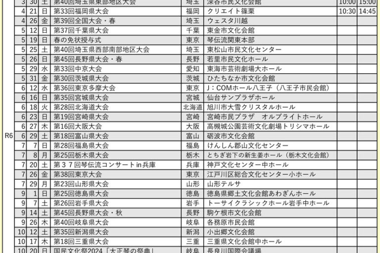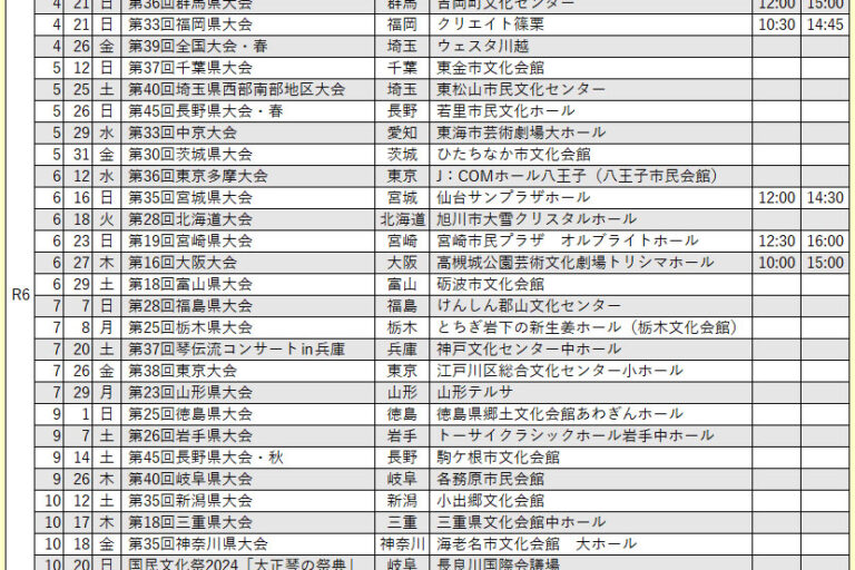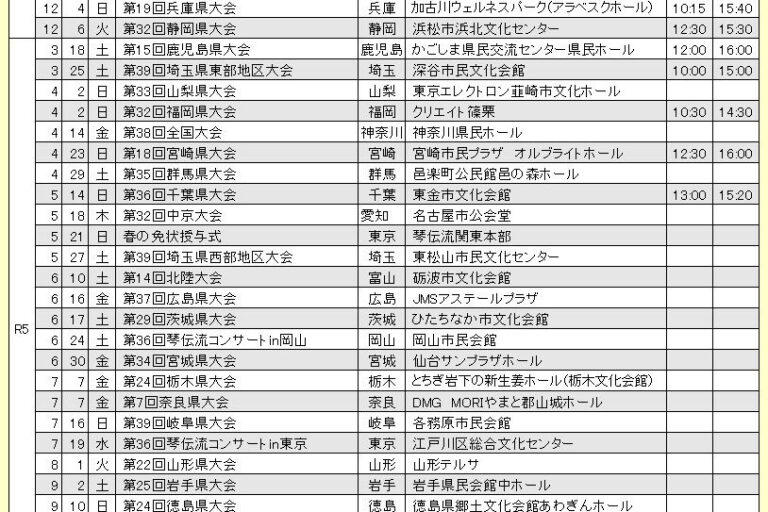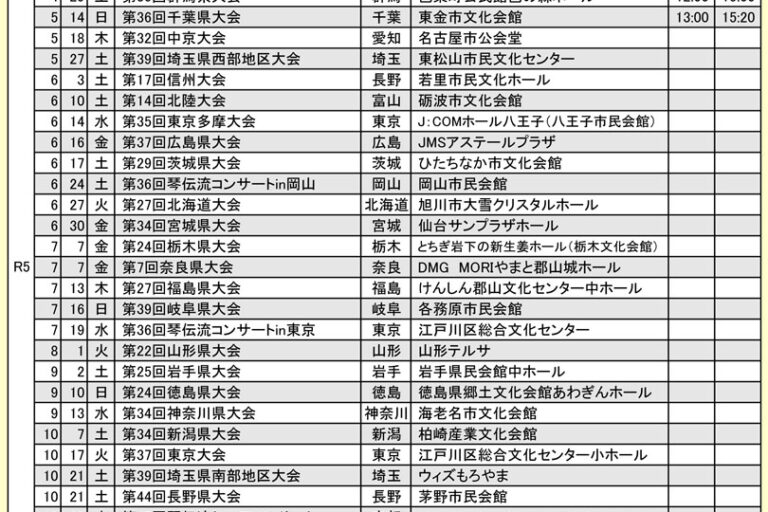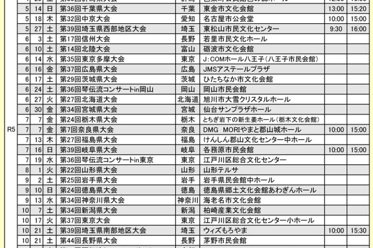 現在出場グループの募集をしている琴伝流の全国大会や県大会をお知らせします。 申込先の連絡先は、ホームページ上メニューボタン「琴伝流の歴史の紹介」内の右メニューボタン「本部教室」のページをご覧ください。 また、ほとんどの県…