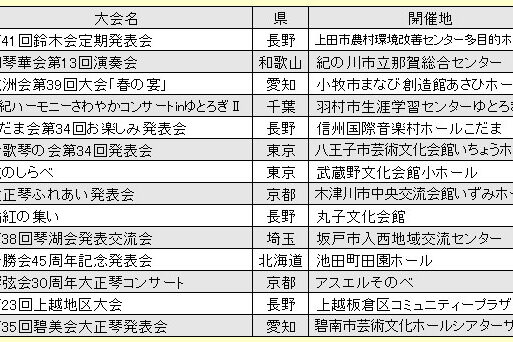 現在出場グループの募集をしている琴伝流大正琴の全国大会や県大会をお知らせします。 申込先の連絡先は、ホームページの「組織・団体」から「本社と直営教室」をご覧ください。 また、ほとんどの県大会が他県のグループの参加も可能で…