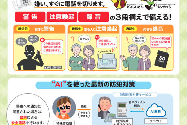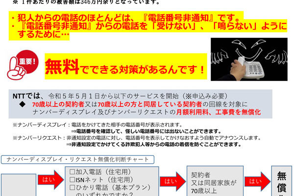 今月も長野県特殊詐欺被害防止協力企業の琴伝流へ長野県からチラシが届きました。 固定電話に直接電話してくる特殊詐欺は高齢者が被害者になることが多いようです。 自分が被害者にならないためにも、留守番電話や迷惑電話防止機能付き…