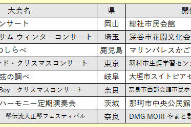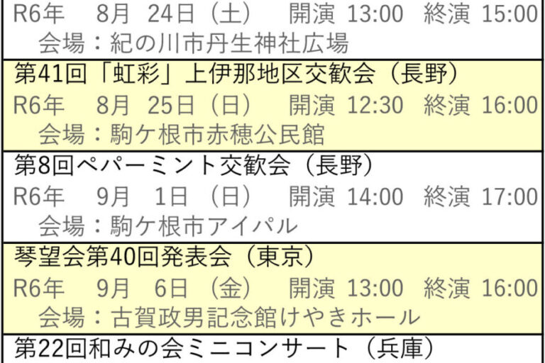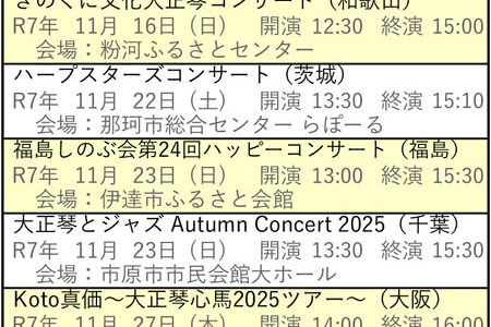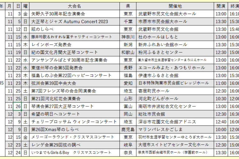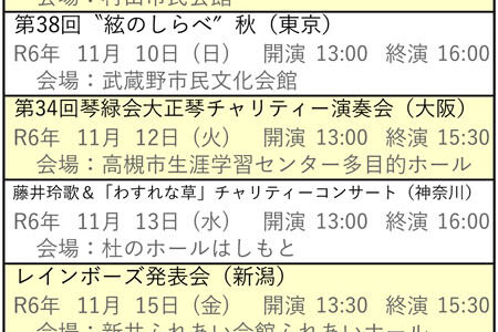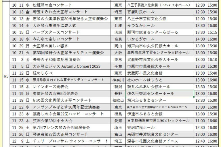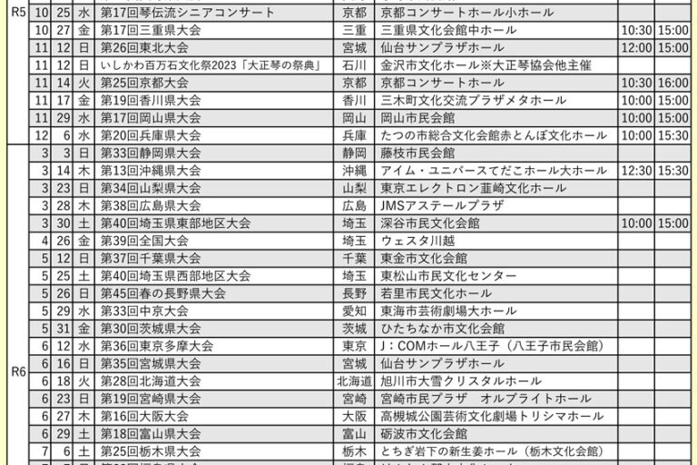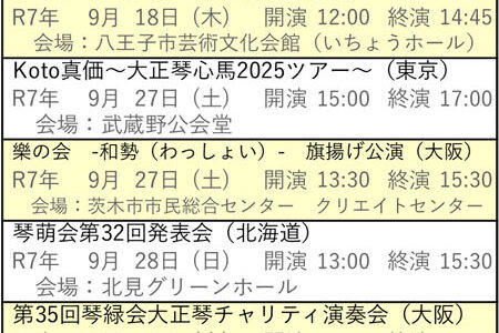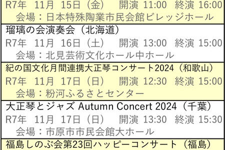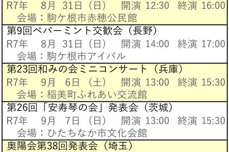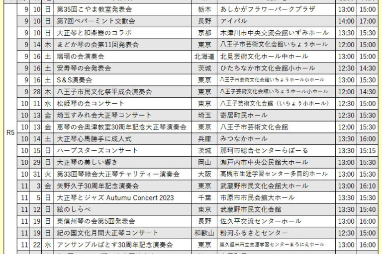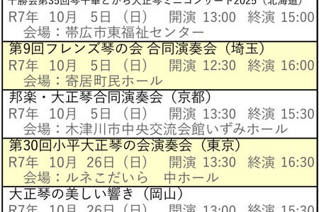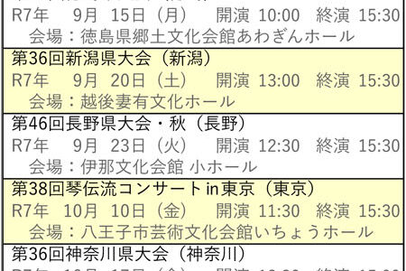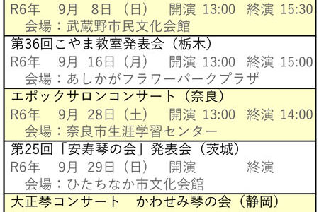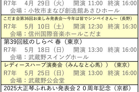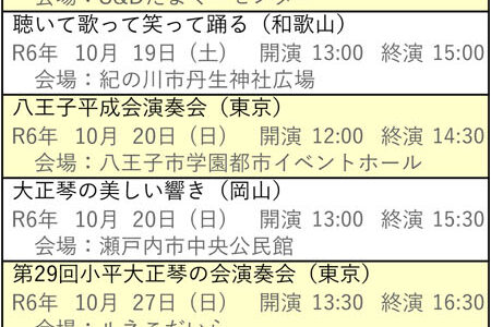 向こう6ヶ月分の琴伝流および公益社団法人大正琴協会主催の全国大会や県大会をご案内します。 グループが心をひとつにして演奏する大正琴音楽をお楽しみください。 ※開演・終演時間は都合により変更する場合があります。 ※「お知ら…