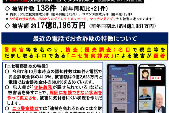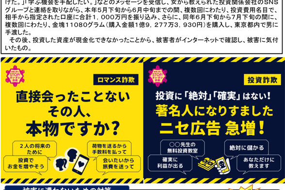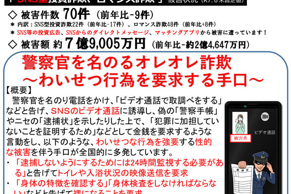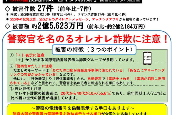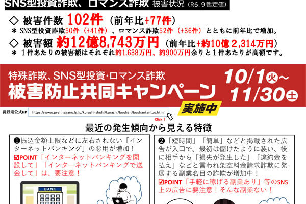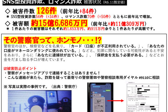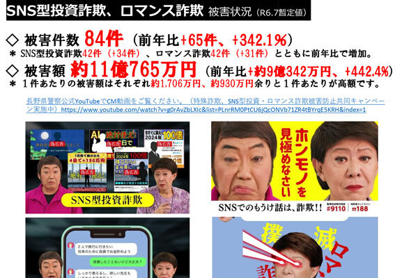 長野県の特殊詐欺被害防止認証団体の琴伝流からお知らせです。 5月にもお知らせした警察官を名乗る詐欺が減らないようです。 「オレオレ詐欺」と言えば高齢者を騙すイメージがありましたが、今ではロマンス詐欺や投資詐欺に加え、お金…