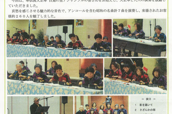 明治中期から昭和の初めにかけて、無伴奏(アカペラ)やバイオリンを弾きながら世相風刺の「演説歌」を歌う演歌師が登場し、庶民のうっぷんを晴らす多くの流行歌が生まれました。 平成22年の「第4回琴伝流シニアコンサート」と翌23…