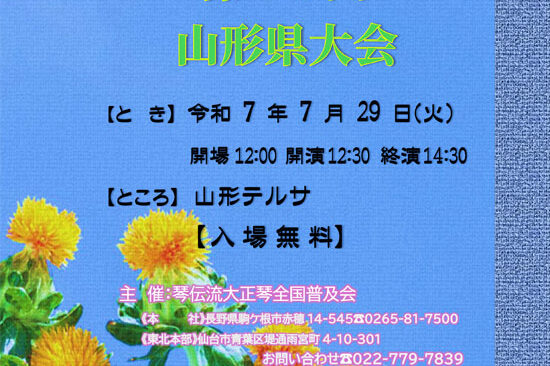 7月29日(火)に山形市の山形テルサで「第24回山形県大会」が開催されます。 外は猛暑でも、会場内はエアコンが効いて快適です。 大正琴を聴きたいという方はもちろん、涼しいところでゆっくりしたいという方もお気軽にご来場くだ…