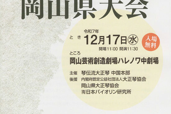 12月17日(水)に岡山市の岡山芸術創造劇場ハレノワで「第18回岡山県大会」が開催されます。 今年は3月12日の沖縄県大会で琴伝流演奏会がスタートし、この大会が今年最後の演奏会です。 今年も仲間と共に大正琴で楽しく過ごせ…