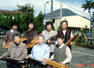 私たちは伊豆七島八丈島八丈町大賀郷老人会大正琴スミレグループのメンバーで、最高年齢88歳、平均年齢76歳ですが、年の割には若く見えて明るい皆さんです。