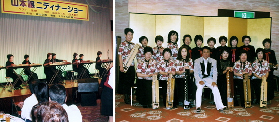 風薫る5月、愛知県知立市のホテルにて演歌の大御所である「山本譲二ディナーショー」があり、私達琴美会17名は「みちのくひとり旅」「風雪ながれ旅」「男と女」「第三の男」等を、1部と2部の2回楽しく演奏させていただきました。